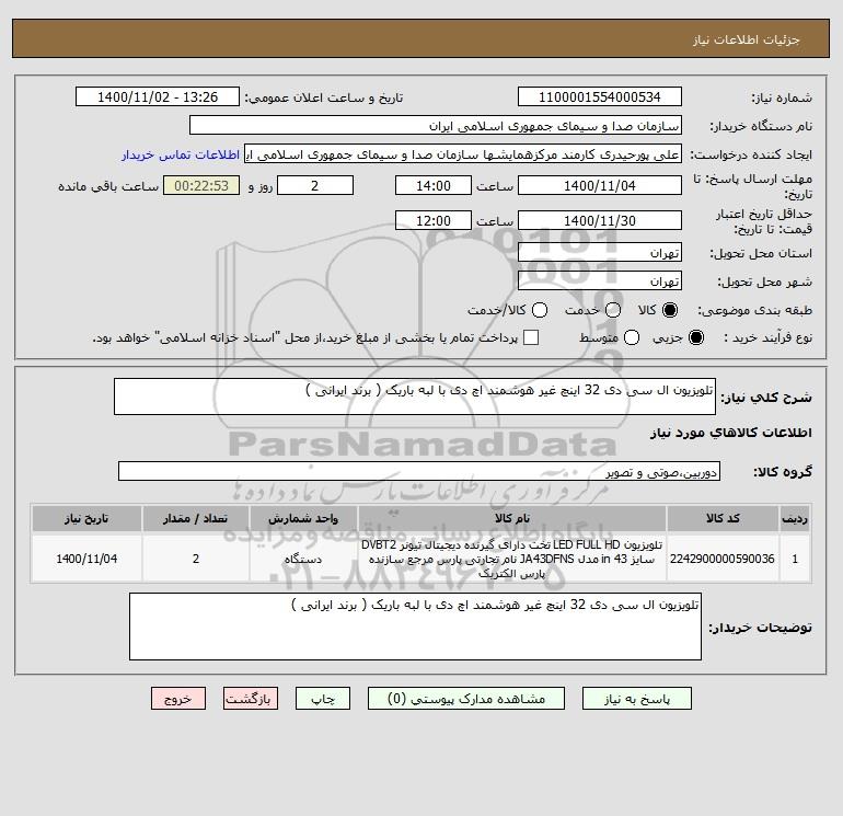 | 1 | 2242900000590036 | تلویزیون LED FULL HD تخت دارای گیرنده دیجیتال تیونر DVBT2 سایز 43 in مدل JA43DFNS نام تجارتی پارس مرجع سازنده پارس الکتریک | دستگاه | 2 | 1400/11/04 |