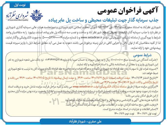 شهرداری نظراباد به استناد مجوز شماره 296 / ش 96.12.13 شورای محترم اسلایم شهر شهرداری وصورتجلسه هیات عالی سرمایه گذاری شهرداری در نظر دارد با جذب سرمایه گذار، تبلیغات محیطی سطح شهر نظرآباد و ساخت و نصب سه دستگاه پل عابر پیاده استند، بیلبورد را به متقاضیان واجد شرایط با بهره گیری از سامانه تدارکات الکترونیکی دولت و با شماره مزایده 5000005366000004 به صورت الکترونیکی واگذار نماید. لذا از کلیه متقاضیان که از توان مالی و اجرایی کافی در این زمینه برخوردار می باشند دعوت به عمل می آید مطابق شرایط ذیل با واریز سپرده قیمت پیشنهادی خود را ارایه نمایند.