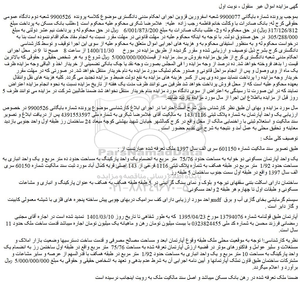 بموجب پرونده شماره بایگانی 9900077 شعبه اسفرورین قزوین اجرای احکام مدنی دادگستری موضوع کلاسه پرونده 9900526 شعبه دوم دادگاه عمومی حقوقی کرج له: بانک صادرات با وکالت خانم فاطمه رجب زاده علیه: غلامرضا شکری محکوم علیه محکوم است 1-طلب بانک مسکن به پرداخت مبلغ 317/126/812 ریال) در حق محکوم له و2- طلب بانک صادرات به مبلغ 6/001/873/200 ریال در حق محکوم له و پرداخت نیم عشر دولتی به مبلغ 305/288/000 در حق صندوق دولت. با توجه به اینکه محکوم علیه در مهلت قانونی در مهلت مقرر نسبت به انجام مفاد حکم اقدام ننموده است بنا به درخواست محکوم له و به منظور استیفای محکوم به و هزینه های اجرایی اموال متعلق به محکوم علیه از سوی این اجرا توقیف و توسط کارشناسی دادگستری کرج بشرح ذیل توصیف و ارزیابی شده و مقرر گردیده از طریق مزایده در مورخ 1400/11/30 از ساعت 8 صبح تا 9 در محل اجرای احکام مدنی شعبه دادگستری کرج از طریق مزایده بفروش برسد. مزایده از قیمت5/000/000/000 ریال شروع و به هر شخص حقیقی و حقوقی که بالاترین قیمت را بدهد فروخته خواهد شد. ده درصد از وجه مزایده را فی المجلس بصورت وجه نقد یا چک بانکی تضمینی از خریدار اخذ و الباقی وجه مزایده ظرف یک ماه از وی وصول و پس از انجام مراحل قانونی و صدور حکم تملیک مورد مزایده به نام خریدار منتقل خواهد شد. در صورتی که در مهلت مقرر خریدار وجه مزایده را پرداخت ننماید سپرده وی پس از کسر هزینه های مزایده به نفع دولت ضبط و مزایده تجدید می گردد. کلیه هزینه های نقل وانتقال بعهده محکوم علیه است که از محل فروش پرداخت خواهد شد طرفین می توانند ظرف مدت یک هفته از تاریخ مزایده نسبت به نحوه انجام مزایده اعتراض نمایند که در این صورت تا رسیدگی به اعتراض از سوی دادگاه مورد مزایده بنام خریدار منتقل نخواهد شد ضمنا طالبین شرکت در مزایده می توانند ظرف 5 روز قبل از مزایده بااطلاع این اجرا از مال مورد مزایده بازدید نمایند.