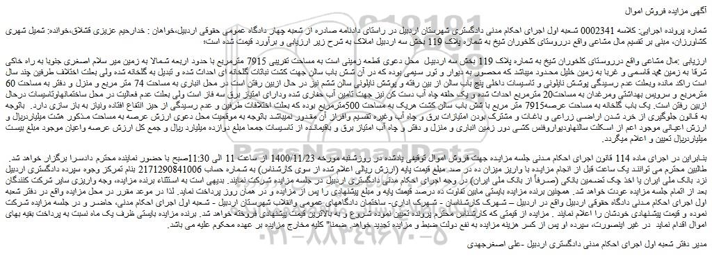 شماره پرونده اجرایی: کلاسه 0002341 شعبه اول اجرای احکام مدنی دادگستری شهرستان اردبیل در راستای دادنامه صادره از شعبه چهار دادگاه عمومی حقوقی اردبیل،خواهان : خدارحیم عزیزی قشلاق،خوانده: شمیل شهری کشاورزان، مبنی بر تقسیم مال مشاعی واقع درروستای کلخوران شیخ به شماره پلاک 119 بخش سه اردبیل املاک به شرح زیر ارزیابی و برآورد قیمت شده است؛