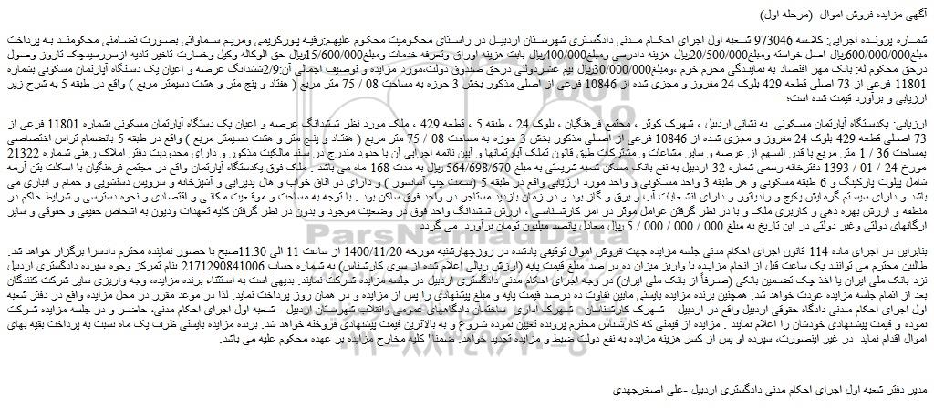 شماره پرونده اجرایی: کلاسه 973046 شعبه اول اجرای احکام مدنی دادگستری شهرستان اردبیل در راستای محکومیت محکوم علیهم:رقیه پورکریمی ومریم سماواتی بصورت تضامنی محکومند به پرداخت مبلغ600/000/000ریال اصل خواسته ومبلغ20/500/000ریال هزینه دادرسی ومبلغ400/000ریال بابت هزینه اوراق وتعرفه خدمات ومبلغ15/600/000ریال حق الوکاله وکیل وخسارت تاخیر تادیه ازسررسیدچک تاروز وصول درحق محکوم له: بانک مهر اقتصاد به نمایندگی محرم خرم ،ومبلغ30/000/000ریال نیم عشردولتی درحق صندوق دولت،مورد مزایده و توصیف اجمالی آن:2/9ششدانگ عرصه و اعیان یک دستگاه آپارتمان مسکونی بشماره 11801 فرعی از 73 اصلی قطعه 429 بلوک 24 مفروز و مجزی شده از 10846 فرعی از اصلی مذکور بخش 3 حوزه به مساحت 08 / 75 متر مربع ( هفتاد و پنج متر و هشت دسیمتر مربع ) واقع در طبقه 5 به شرح زیر ارزیابی و برآورد قیمت شده است؛