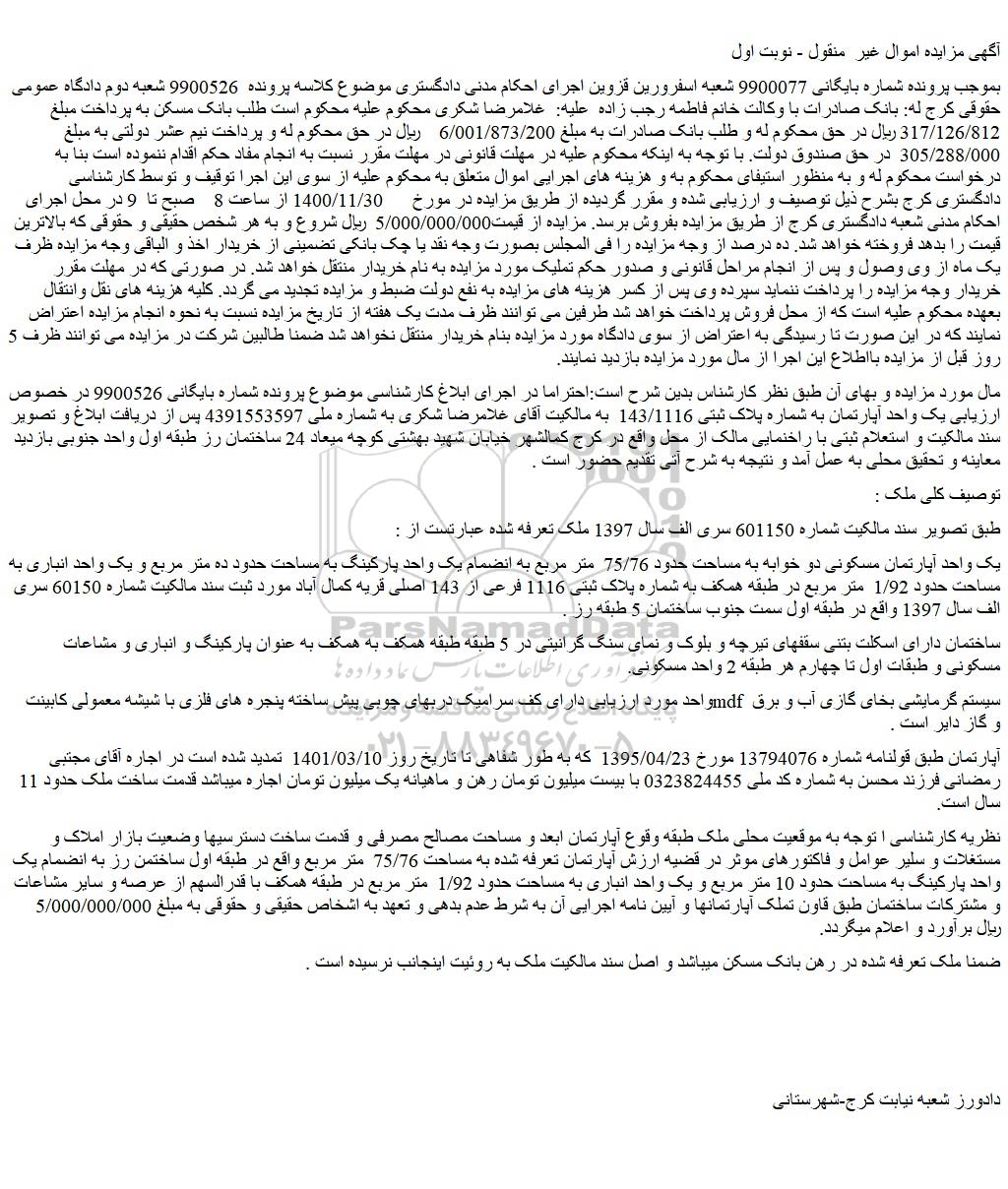بموجب پرونده شماره بایگانی 9900077 شعبه اسفرورین قزوین اجرای احکام مدنی دادگستری موضوع کلاسه پرونده 9900526 شعبه دوم دادگاه عمومی حقوقی کرج له: بانک صادرات با وکالت خانم فاطمه رجب زاده علیه: غلامرضا شکری محکوم علیه محکوم است طلب بانک مسکن به پرداخت مبلغ 317/126/812 ریال در حق محکوم له و طلب بانک صادرات به مبلغ 6/001/873/200 ریال در حق محکوم له و پرداخت نیم عشر دولتی به مبلغ 305/288/000 در حق صندوق دولت. با توجه به اینکه محکوم علیه در مهلت قانونی در مهلت مقرر نسبت به انجام مفاد حکم اقدام ننموده است بنا به درخواست محکوم له و به منظور استیفای محکوم به و هزینه های اجرایی اموال متعلق به محکوم علیه از سوی این اجرا توقیف و توسط کارشناسی دادگستری کرج بشرح ذیل توصیف و ارزیابی شده و مقرر گردیده از طریق مزایده در مورخ 1400/11/30 از ساعت 8 صبح تا 9 در محل اجرای احکام مدنی شعبه دادگستری کرج از طریق مزایده بفروش برسد. مزایده از قیمت5/000/000/000 ریال شروع و به هر شخص حقیقی و حقوقی که بالاترین قیمت را بدهد فروخته خواهد شد. ده درصد از وجه مزایده را فی المجلس بصورت وجه نقد یا چک بانکی تضمینی از خریدار اخذ و الباقی وجه مزایده ظرف یک ماه از وی وصول و پس از انجام مراحل قانونی و صدور حکم تملیک مورد مزایده به نام خریدار منتقل خواهد شد. در صورتی که در مهلت مقرر خریدار وجه مزایده را پرداخت ننماید سپرده وی پس از کسر هزینه های مزایده به نفع دولت ضبط و مزایده تجدید می گردد. کلیه هزینه های نقل وانتقال بعهده محکوم علیه است که از محل فروش پرداخت خواهد شد طرفین می توانند ظرف مدت یک هفته از تاریخ مزایده نسبت به نحوه انجام مزایده اعتراض نمایند که در این صورت تا رسیدگی به اعتراض از سوی دادگاه مورد مزایده بنام خریدار منتقل نخواهد شد ضمنا طالبین شرکت در مزایده می توانند ظرف 5 روز قبل از مزایده بااطلاع این اجرا از مال مورد مزایده بازدید نمایند.