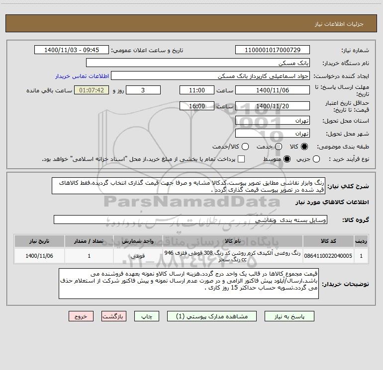 شرح کلی نیاز: رنگ وابزار نقاشی مطابق تصویر پیوست،کدکالا مشابه و صرفا جهت قیمت گذاری انتخاب گردیده،فقط کالاهای قید شده در تصویر پیوست قیمت گذاری گردد .