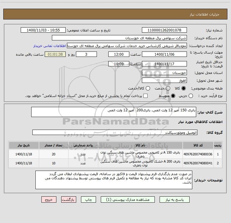 شرح کلی نیاز: باتری 150 آمپر 12 ولت اتمی، باتری200 آمپر 12 ولت اتمی