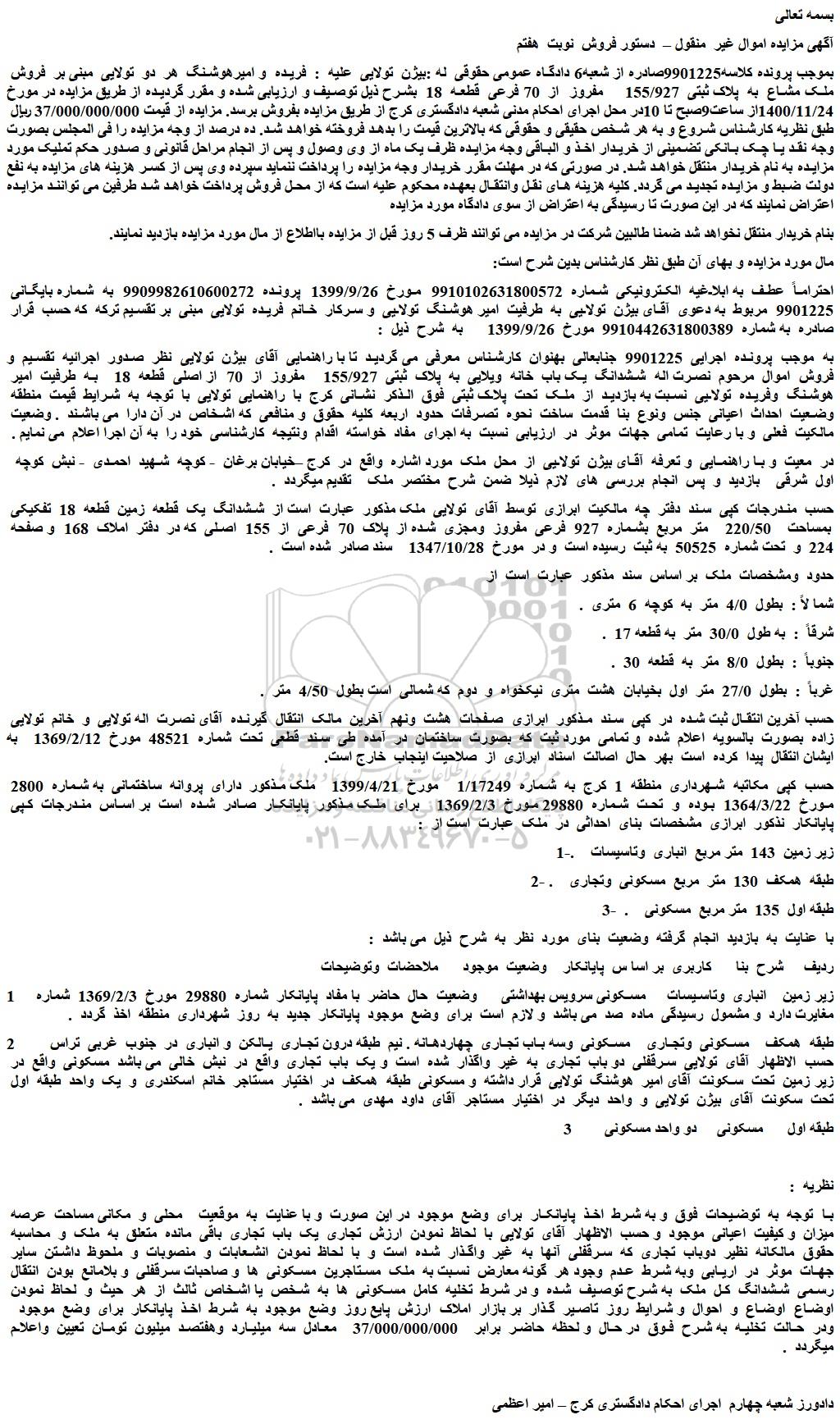 بموجب پرونده کلاسه9901225صادره از شعبه6 دادگاه عمومی حقوقی له :بیژن تولایی علیه : فریده و امیرهوشنگ هر دو تولایی مبنی بر فروش ملک مشاع به پلاک ثبتی 155/927 مفروز از 70 فرعی قطعه 18 بشرح ذیل توصیف و ارزیابی شده و مقرر گردیده از طریق مزایده در مورخ 1400/11/24از ساعت9صبح تا 10در محل اجرای احکام مدنی شعبه دادگستری کرج از طریق مزایده بفروش برسد. مزایده از قیمت 37/000/000/000 ریال طبق نظریه کارشناس شروع و به هر شخص حقیقی و حقوقی که بالاترین قیمت را بدهد فروخته خواهد شد. ده درصد از وجه مزایده را فی المجلس بصورت وجه نقد یا چک بانکی تضمینی از خریدار اخذ و الباقی وجه مزایده ظرف یک ماه از وی وصول و پس از انجام مراحل قانونی و صدور حکم تملیک مورد مزایده به نام خریدار منتقل خواهد شد. در صورتی که در مهلت مقرر خریدار وجه مزایده را پرداخت ننماید سپرده وی پس از کسر هزینه های مزایده به نفع دولت ضبط و مزایده تجدید می گردد. کلیه هزینه های نقل وانتقال بعهده محکوم علیه است که از محل فروش پرداخت خواهد شد طرفین می توانند مزایده اعتراض نمایند که در این صورت تا رسیدگی به اعتراض از سوی دادگاه مورد مزایده