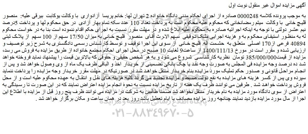 به موجب پرونده کلاسه 0000248 صادره از اجرای احکام مدنی دادگاه خانواده 2 تهران لها: خانم پریسا  آزادواری  با وکالت یوکابت  بیرقی علیه:  منصور قلیچ خانی  با وکالت  میثم رمضانخانی که محکوم علیه محکوم است به پرداخت تعداد 110 عدد سکه تمام بهار آزادی  در حق محکوم لها و پرداخت 5درصد نیم عشر دولتی با توجه به اینکه اجرائیه صادره به محکوم علیه ابلاغ شده و در مهلت مقرر نسبت به اجرای حکم اقدام ننموده است بنا به در خواست محکوم له به منظور استیفای محکوم به و هزینه اجرایی ملک توقیفی  سهم الارث آقای  منصور  قلیچ خانی به میزان 17/50 سهم از 100 سهم  از پلاک ثبتی 40894 فرعی از170 اصلی  متعلق به  حشمت اله  قلیچ خانی  از سوی این اجرا توقیف و توسط کارشناس رسمی دادگستری به شرح زیر توصیف و ارزیابی شده و مقرر است در مورخ 1400/111/13 از ساعت9 لغایت 10 صبح در محل اجرای احکام مجتمع خانواده از طریق مزایده به فروش می رسد، مزایده از قیمت385/000/000 تومان  نظریه کارشناسی  شروع می شود و به هر شخص حقیقی و حقوقی که بالاترین قیمت را پیشنهاد نماید فروخته خواهد شد ده درصد وجه مزایده فی المجلس به صورت وجه نقد یا چک بانکی تضمینی از خریدار اخذ و الباقی ظرف یک ماه از وی وصول خواهد شد و پس از انجام مراحل قانونی و صدور حکم تملیک مورد مزایده بنام خریدار منتقل خواهد شد در صورتیکه در مهلت مقرر خریدار وجه مزایده را پرداخت ننماید سپرده وی پس از کسر هزینه های مزایده به نفع دولت ضبط و مزایده تجدید می گردد کلیه هزینه های نقل و انتقال به عهده محکوم علیه است و از محل فروش پرداخت خواهد شد . طرفین می توانند ظرف یک هفته از تاریخ مزایده نسبت به نحوه انجام مزایده اعتراض نمایند که در این صورت تا رسیدگی به اعتراض از سوی دادگاه مورد مزایده به نام خریدار منتقل نخواهد شد ضمنا طالبین به شرکت در مزایده می توانند ظرف پنج روز قبل از مزایده با اطلاع این اجرا از مال مورد مزایده بازدید نمایند چنانچه روز مزایده مصادف با ایام تعطیل باشد روز بعد در همان ساعت و مکان برگزار خواهد شد .