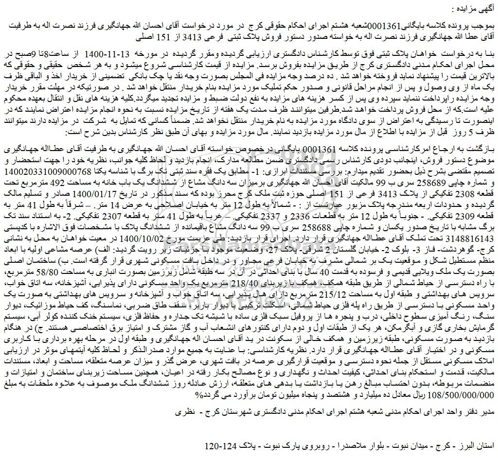 بموجب پرونده کلاسه بایگانی0001361شعبه هشتم اجرای احکام حقوقی کرج در مورد درخواست آقای احسان الله جهانگیری فرزند نصرت اله به طرفیت آقای عطا الله جهانگیری فرزند نصرت اله به خواسته صدور دستور فروش پلاک ثبتی فرعی 3413 از 151 اصلی