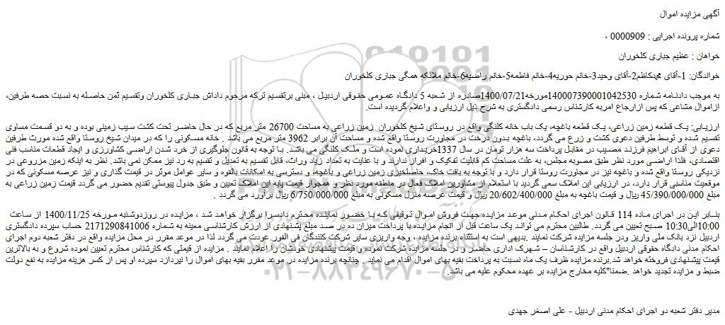 ،به موجب دادنامه شماره 140007390001042530مورخه1400/07/21صادره از شعبه 5 دادگاه عمومی حقوقی اردبیل ، مبنی برتقسیم ترکه مرحوم داداش جباری کلخوران وتقسیم ثمن حاصله به نسبت حصه طرفین ازاموال مشاعی که پس ازارجاع امربه کارشناس رسمی دادگستری به شرح ذیل ارزیابی و واعلام گردیده است.