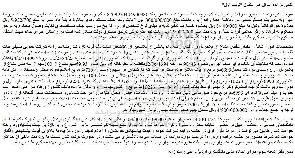 بموجب درخواست صدور اجراییه و اجرای حکم مربوطه به شماره دادنامه مربوطه 8709970404900980 حکم برمحکومیت شرکت شرکت تعاونی صیفی جات مزرعه امیر (به مدیریت عسگرحاجی پوروفاطمه عطارزاده ) به پرداخت مبلغ 300/000/000 ریال ازبابت وجه چک مستند دعوی بعلاوة هزینة دادرسی به مبلغ 5/952/700 ریال بعلاوة حق الوکالة وکیل به مبلغ 8/400/000 ریال بعلاوة خسارت تأخیرتأدیه برمبنای نرخ شاخص تورم ازتاریخ سررسید چک مستنددعوی لغایت وصول محکوم به درحق محکوم له فرهاد برزگر جلالی فرزند جلیل و پرداخت مبلغ 15/000/000 ریال بابت نیم عشردولتی درحق صندوق دولت صادر شده است در راستای اجرای حکم جهت استیفاء محکوم به اموال محکوم علیه توقیف و پس از ارجاع به کارشناس دادگستری نظریه خود را به شرح زیر اعلام نموده است: