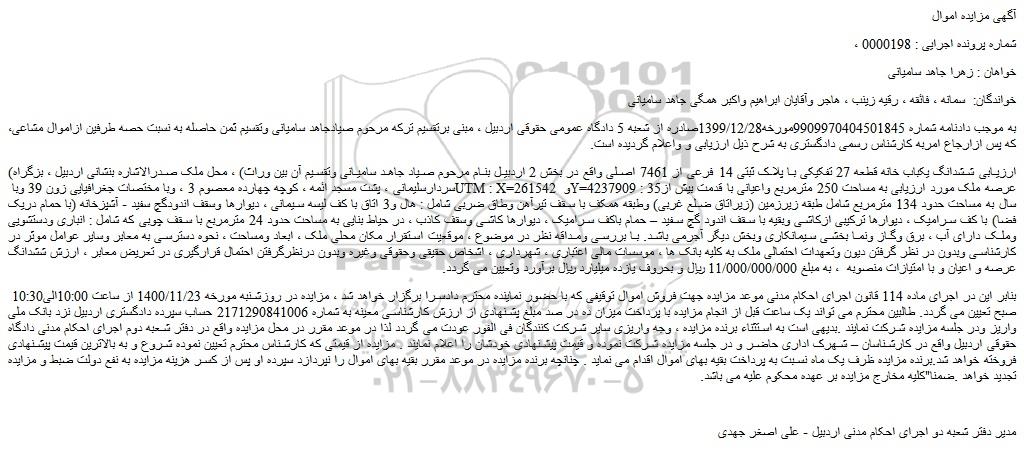 ،به موجب دادنامه شماره 9909970404501845مورخه1399/12/28صادره از شعبه 5 دادگاه عمومی حقوقی اردبیل ، مبنی برتقسیم ترکه مرحوم صیادجاهد سامیانی وتقسیم ثمن حاصله به نسبت حصه طرفین ازاموال مشاعی که پس ازارجاع امربه کارشناس رسمی دادگستری به شرح ذیل ارزیابی و واعلام گردیده است.