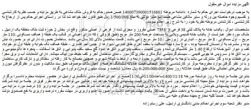 به موجب درخواست اجرای حکم به شماره  دادنامه مربوطه 140007390001516861 ضمن صدورحکم به فروش ملک مشاعی به طریق مزایده و حسب نظریه کارشناسی و تقسیم وجوه حاصله بین ورثه و سایر مالکین مشاعی ضمنا نیم عشر دولتی به مبلغ 1/500/000 ریال طبق قانون اخذ خواهد شد لذا در راستای اجرای حکم پس از ارجاع به کارشناسی ، کارشناس مربوطه نظریه خود را به شرح زیر اعلام نمودند:
