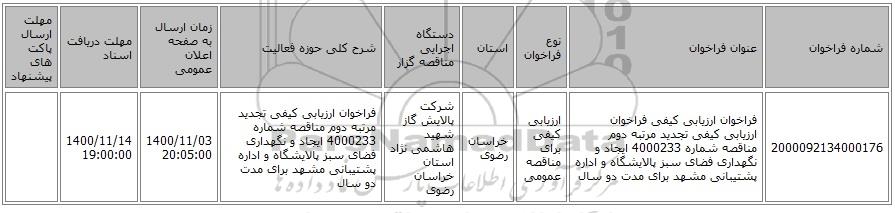 | 2000092134000176 | فراخوان ارزیابی کیفی فراخوان ارزیابی کیفی تجدید مرتبه دوم مناقصه شماره 4000233 ایجاد و نگهداری فضای سبز پالایشگاه و اداره پشتیبانی مشهد برای مدت دو سال | ارزیابی کیفی برای مناقصه عمومی | خراسان رضوی | شرکت پالایش گاز شهید هاشمی نژاد استان خراسان رضوی | فراخوان ارزیابی کیفی تجدید مرتبه دوم مناقصه شماره 4000233 ایجاد و نگهداری فضای سبز پالایشگاه و اداره پشتیبانی مشهد برای مدت دو سال | 1400/11/03 20:05:00 | 1400/11/14 19:00:00 |