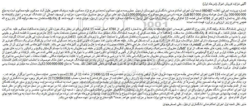 شماره پرونده اجرایی: کلاسه 980487 شعبه اول اجرای احکام مدنی دادگستری شهرستان اردبیل مطروحه مابین، محکوم له:هادی فرج نژاد محکوم علیه :سیامک فخیمی خلیل آباد محکوم علیه محکوم است به مبلغ 300/000/000 ریال اصل خواسته ومبلغ 8/807/000ریال هزینه دادرسی درحق محکوم له ومبلغ15/000/000ریال نیم عشر دولتی درحق صندوق دولت،مورد مزایده و توصیف اجمالی آن: ششدانگ عرصه و اعیان یکبابخانه به پلاک ثبتی به شماره 15فرعی از 4764 اصلی قطعه 15 تفکیکی واقع در بخش یک حوزه ثبتی اردبیل به مالکیت محکوم علیه به آدرس :اردبیل، خیابان شاهد ، کوچه شاهد 8، پلاک46،ساختمان سه سقف،وثیقه گذار بنام روح اله فخیمی به شرح زیر ارزیابی و برآورد قیمت شده است؛