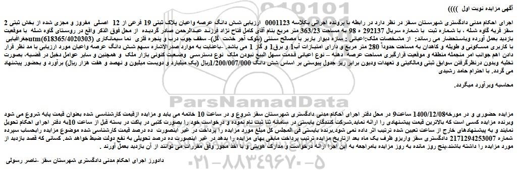 اجرای احکام مدنی دادگستری شهرستان سقز در نظر دارد در رابطه با پرونده اجرائی بکلاسه 0001123 ارزیابی شش دانگ عرصه واعیان پلاک ثبتی 19 فرعی از 12 اصلی مفروز و مجزی شده از بخش ثبتی 2 سقز قریه گاوه شله ، با شماره ثبت با شماره سریال 292137 ه 98 به مساحت 363/23 متر مربع بنام آقای کامل فتاح نژاد فرزند عبدالرحمن صادر گردیده از محل فوق الذکر واقع در روستای گاوه شله با موقعیت جغرافیایی utm(618365/4020303) بازدید بعمل آورده وباستحضار می رساند: از مشخصات ملک:اعیانی : سازه دیوار باربر با مصالح سنتی (بلوک آجر خشت گل)- سقف چوب درب و پنجره فلزی نما سیمانکاری با کاربری مسکونی و طویله و کاهدان به مساحت حدوداً 280 متر مربع و دارای امتیازات آب1 و برق1 و گاز 1 می باشد. -باعنایت به موارد صدرالاشاره سهم شش دانگ عرصه واعیان مورد ارزیابی با مد نظر قرار دادن اهم جوانب امر منجمله منطقه و موقعیت قرارگیری مساحت عرصه دهنه – نوع اعیانی قدمت سهل البیع نبودن ملک نوع دسترسی وضعیت کنونی بازار ملک و همچنین و سایر عوامل دخیل در قضیه، بصورت تخلیه وبدون درنظرگرفتن سوابق ثبتی ومالکیتی و تعهدات ودیون برابر ریز جدول پیوستی بر اساس شش دانگ 1/200/007/000ریال (یک میلیارد و دویست میلیون و نهصد و هفت هزار ریال) برآورد و بحضور پیشنهاد می گردد. با احترام حامد رشیدی