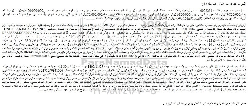 شماره پرونده اجرایی: کلاسه 0002251 شعبه اول اجرای احکام مدنی دادگستری شهرستان اردبیل در راستای محکومیت محکوم علیه :بهرام حضرتی قره چناق به پرداخت مبلغ1/400/000/000ریال اصل خواسته ومبلغ47/826/000ریال بابت هزینه دادرسی ومبلغ61/800/000ریال حق الوکاله وکیل درحق محکوم له:علیرضا افتخاری ،ومبلغ70/000/000ریال نیم عشردولتی درحق صندوق دولت ،مورد مزایده و توصیف اجمالی آن:یکدستگاه خودرو رنو بشماره انتظامی91ایران91ی161 واقع درپارکینگ زارعی اردبیل به شرح زیر ارزیابی و برآورد قیمت شده است؛