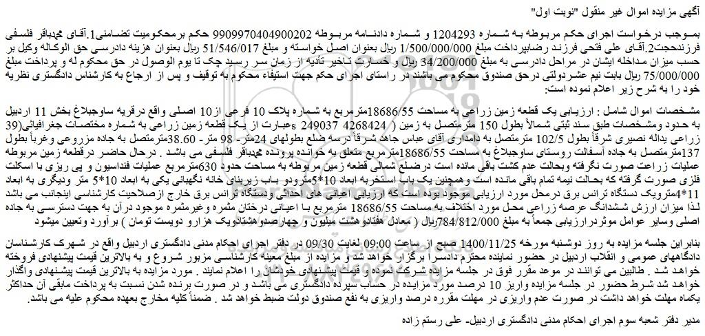 مشخصات اموال شامل : ارزیابی یک قطعه زمین زراعی به مساحت 18686/55مترمربع به شماره پلاک 10 فرعی از10 اصلی واقع درقریه ساوجبلاغ بخش 11 اردبیل عبارت از یک قطعه زمین زراعی به شماره مختصات جغرافیائی(39s 249037 4268424 ) به حدود ومشخصات طبق سند ثبتی شمالاً بطول 150 مترمتصل به زمین زراعی یداله نصیری شرقاً بطول 102/5 مترمتصل به دامداری آقای عباس جاهد شرقاً درسه ضلع بطولهای 24متر- 98 متر- 38.60مترمتصل به جاده مزروعی وغرباً بطول 137مترمتصل به جاده آسفالت روستای ساوجبلاغ به مساحت 18686/55مترمربع متعلق به خوانده پرونده محمدباقر فلسفی می باشد . درحال حاضر درقطعه زمین مربوطه عملیات زراعت صورت نگرفته وبحالت عدم کشت باقی مانده است درضلع شمالی قطعه زمین مربوطه به مساحت حدود 630مترمربع عملیات فنداسیون و پی ریزی با اسکلت فلزی صورت گرفته که بحالت نیمه تمام باقی مانده است وهمچنین یک باب استخربه ابعاد 10*5مترودو باب زیربنای خانه نگهبانی یکی به ابعاد 10*5 متر ودیگری به ابعاد 11*4مترویک دستگاه ترانس برق درمحل مورد ارزیابی موجود بوده است که ارزیابی اعیانی های احداثی ودستگاه ترانس برق خارج ازصلاحیت کارشناسی اینجانب می باشد لذا میزان ارزش ششدانگ عرصه زراعی محل مورد اختلاف به مساحت 18686/55 مترمربع با اعیانی درختان مثمره وغیرمثمره موجود درآن به جهت دسترسی به جاده اصلی وسایر عوامل موثردرارزیابی جمعاً به مبلغ 784/812/000ریال ( معادل هفتادوهشت میلیون و چهارصدوهشتادویک هزارو دویست تومان ) برآورد وتعیین میشود