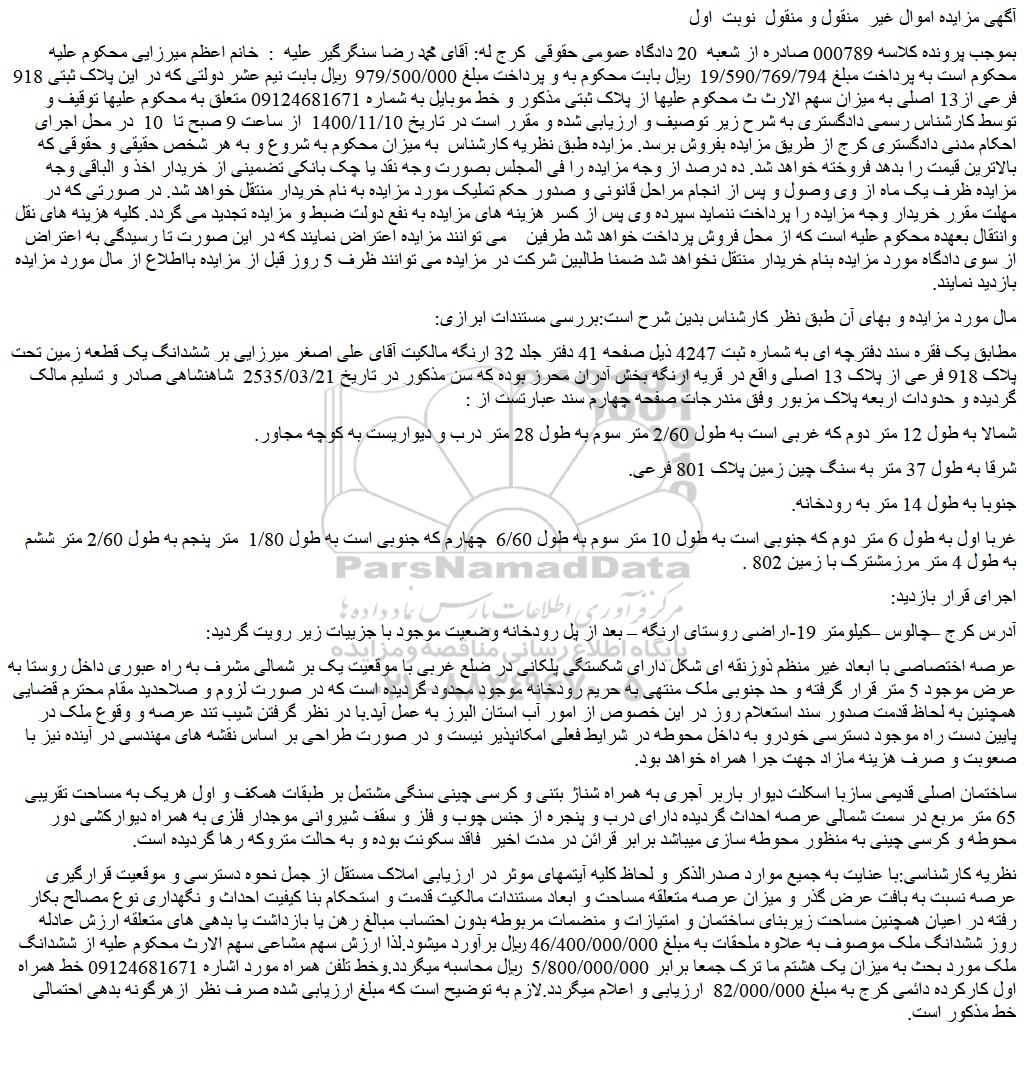 بموجب پرونده کلاسه 000789 صادره از شعبه 20 دادگاه عمومی حقوقی کرج له: آقای محمد رضا سنگرگیر علیه : خانم اعظم میرزایی محکوم علیه محکوم است به پرداخت مبلغ 19/590/769/794 ریال بابت محکوم به و پرداخت مبلغ 979/500/000 ریال بابت نیم عشر دولتی که در این پلاک ثبتی 918 فرعی از13 اصلی به میزان سهم الارث ث محکوم علیها از پلاک ثبتی مذکور و خط موبایل به شماره 09124681671 متعلق به محکوم علیها توقیف و توسط کارشناس رسمی دادگستری به شرح زیر توصیف و ارزیابی شده و مقرر است در تاریخ 1400/11/10 از ساعت 9 صبح تا 10 در محل اجرای احکام مدنی دادگستری کرج از طریق مزایده بفروش برسد. مزایده طبق نظریه کارشناس به میزان محکوم به شروع و به هر شخص حقیقی و حقوقی که بالاترین قیمت را بدهد فروخته خواهد شد. ده درصد از وجه مزایده را فی المجلس بصورت وجه نقد یا چک بانکی تضمینی از خریدار اخذ و الباقی وجه مزایده ظرف یک ماه از وی وصول و پس از انجام مراحل قانونی و صدور حکم تملیک مورد مزایده به نام خریدار منتقل خواهد شد. در صورتی که در مهلت مقرر خریدار وجه مزایده را پرداخت ننماید سپرده وی پس از کسر هزینه های مزایده به نفع دولت ضبط و مزایده تجدید می گردد. کلیه هزینه های نقل وانتقال بعهده محکوم علیه است که از محل فروش پرداخت خواهد شد طرفین می توانند مزایده اعتراض نمایند که در این صورت تا رسیدگی به اعتراض از سوی دادگاه مورد مزایده بنام خریدار منتقل نخواهد شد ضمنا طالبین شرکت در مزایده می توانند ظرف 5 روز قبل از مزایده بااطلاع از مال مورد مزایده بازدید نمایند.