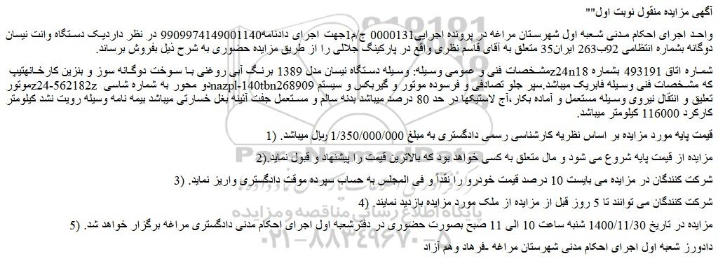 واحد اجرای احکام مدنی شعبه اول شهرستان مراغه در پرونده اجرایی0000131 ج/م1جهت اجرای دادنامه9909974149001140 در نظر داردیک دستگاه وانت نیسان دوگانه بشماره انتظامی 92ب263 ایران35 متعلق به آقای قاسم نظری واقع در پارکینگ جلالی را از طریق مزایده حضوری به شرح ذیل بفروش برساند.