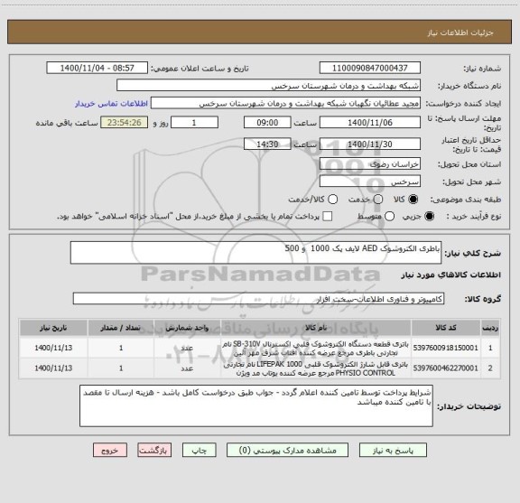 | 2 | 5397600462270001 | باتری قابل شارژ الکتروشوک قلبی LIFEPAK 1000 نام تجارتی PHYSIO CONTROL مرجع عرضه کننده یوتاب مد ویژن | عدد | 1 | 1400/11/13 |