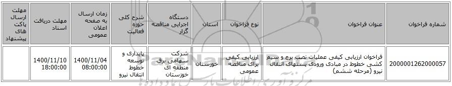 | 2000001262000057 | فراخوان ارزیابی کیفی عملیات نصب برج و سیم کشی خطوط در مبادی ورودی پستهای انتقال نیرو (مرحله ششم) | ارزیابی کیفی برای مناقصه عمومی | خوزستان | شرکت سهامی برق منطقه ای خوزستان | پایداری و توسعه خطوط انتقال نیرو | 1400/11/04 08:00:00 | 1400/11/10 18:00:00 |