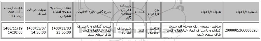 | 2000005366000020 | مناقصه عمومی یک مرحله ای جدول گذاری و بازسازی انهار خیابانها و کوچه های سطح شهر | مناقصه عمومی | البرز | شهرداری نظرآباد | جدول گذاری و بازسازی انهار خیابانها و کوچه های سطح شهر | 1400/11/03 23:55:00 | 1400/11/07 14:30:00 | 1400/11/19 14:30:00 |