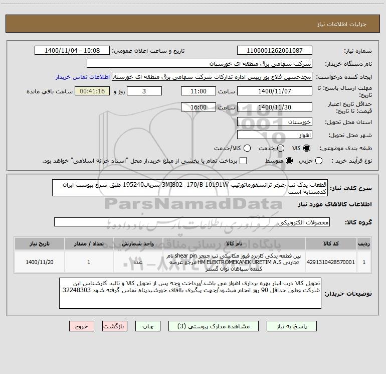 شرح کلی نیاز: قطعات یدک تپ چنجر ترانسفورماتورتیپ 3MI802 170/B-10191W-سریال195240-طبق شرح پیوست-ایران کدمشابه است