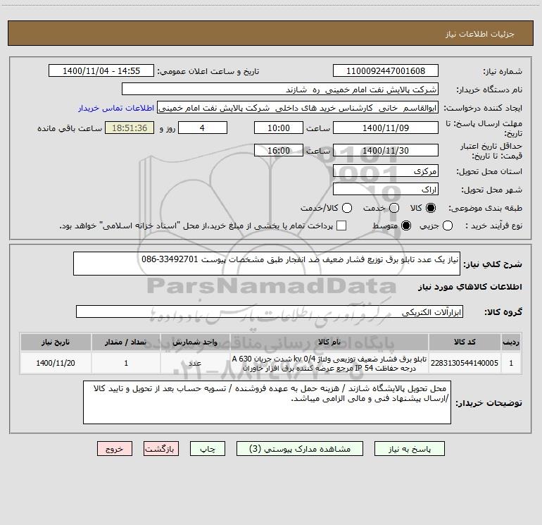 شرح کلی نیاز: نیاز یک عدد تابلو برق توزیع فشار ضعیف ضد انفجار طبق مشخصات پیوست 33492701-086
