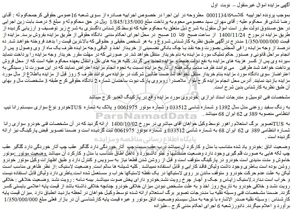 مشخصات فنی اتومبیل و مندرجات اسناد ابرازی :خودروی مورد مزایده واقع در پارکینگ الغدیر کرج میباشد