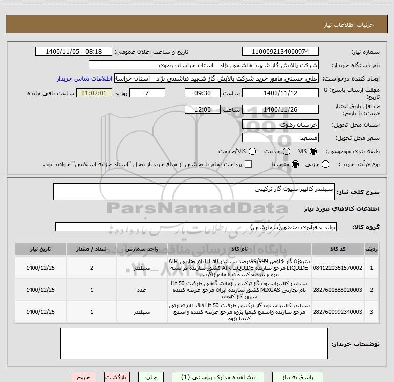 نام دستگاه خریدار:شرکت پالایش گاز شهید هاشمی نژاد استان خراسان رضوی