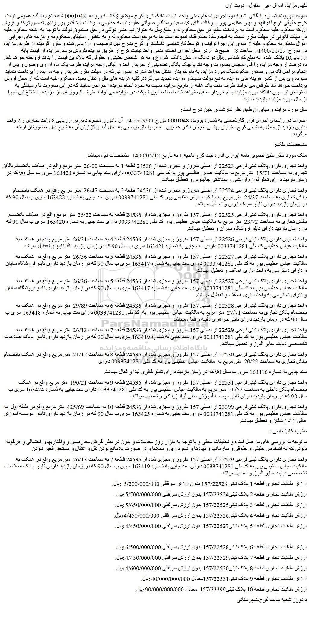 بموجب پرونده شماره بایگانی شعبه دوم اجرای احکام مدنی واحد نیابت دادگستری کرج موضوع کلاسه پرونده 0001048 شعبه دوم دادگاه عمومی نیابت کرج حقوقی کرج له: الهه و بهار عظیمی پور با وکالت آقای محمد سعید رستگار صولتی علیه: نفیسه عظیمی با وکالت لیلا قنبر پور زندی تصمیم ترکه و فروش آن که محکوم علیه محکوم است به پرداخت مبلغ در حق محکوم له و مبلغ ریال به عنوان نیم عشر دولتی در حق صندوق دولت با توجه به اینکه محکوم علیه در مهلت قانونی در مهلت مقرر نسبت به انجام مفاد حکم اقدام ننموده است بنا به درخواست محکوم له و به منظور استیفای محکوم به و هزینه های اجرایی اموال متعلق به محکوم علیه از سوی این اجرا توقیف و توسط کارشناسی دادگستری کرج بشرح ذیل توصیف و ارزیابی شده و مقرر گردیده از طریق مزایده در مورخ 1400/11/19از ساعت 8 صبح تا 9 در محل اجرای احکام مدنی واحد نیابت کرج از طریق مزایده بفروش برسد. مزایده از قیمت پایه ارزیابی10 پلاک شده به مبلغ کارشناسی ریال دو دانگ از شش دانگ شروع و به هر شخص حقیقی و حقوقی که بالاترین قیمت را بدهد فروخته خواهد شد. ده درصد از وجه مزایده را فی المجلس بصورت وجه نقد یا چک بانکی تضمینی از خریدار اخذ و الباقی وجه مزایده ظرف یک ماه از وی وصول و پس از انجام مراحل قانونی و صدور حکم تملیک مورد مزایده به نام خریدار منتقل خواهد شد. در صورتی که در مهلت مقرر خریدار وجه مزایده را پرداخت ننماید سپرده وی پس از کسر هزینه های مزایده به نفع دولت ضبط و مزایده تجدید می گردد. کلیه هزینه های نقل وانتقال بعهده محکوم علیه است که از محل فروش پرداخت خواهد شد طرفین می توانند ظرف مدت یک هفته از تاریخ مزایده نسبت به نحوه انجام مزایده اعتراض نمایند که در این صورت تا رسیدگی به اعتراض از سوی دادگاه مورد مزایده بنام خریدار منتقل نخواهد شد ضمنا طالبین شرکت در مزایده می توانند ظرف 5 روز قبل از مزایده بااطلاع این اجرا از مال مورد مزایده بازدید نمایند.