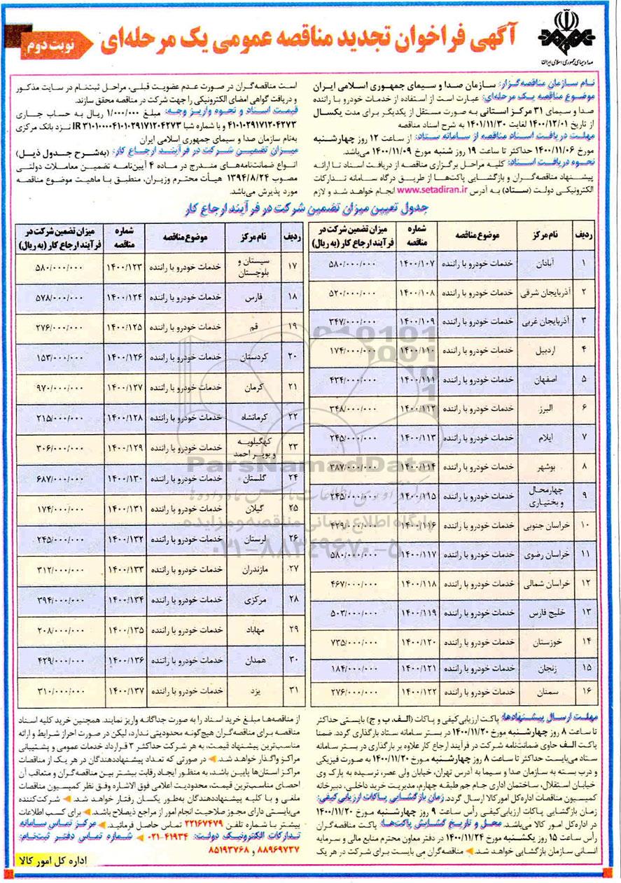 - موضوع مناقصه یک مرحله ای: عبارت است از استفاده از خدمات خودرو با راننده صدا و سیمای 31 مرکز استانی به صورت مستقل از یکدیگر برای مدت یک سال از تاریخ 1400.12.1 لغایت 1401.11.30 به شرح اسناد مناقصه