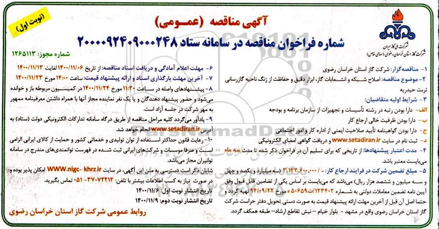 1- موضوع مناقصه: اصلاح شبکه و انشعابات گاز، ابزار دقیق و حفاظت از زنگ ناحیه گازرسانی تربت حیدریه