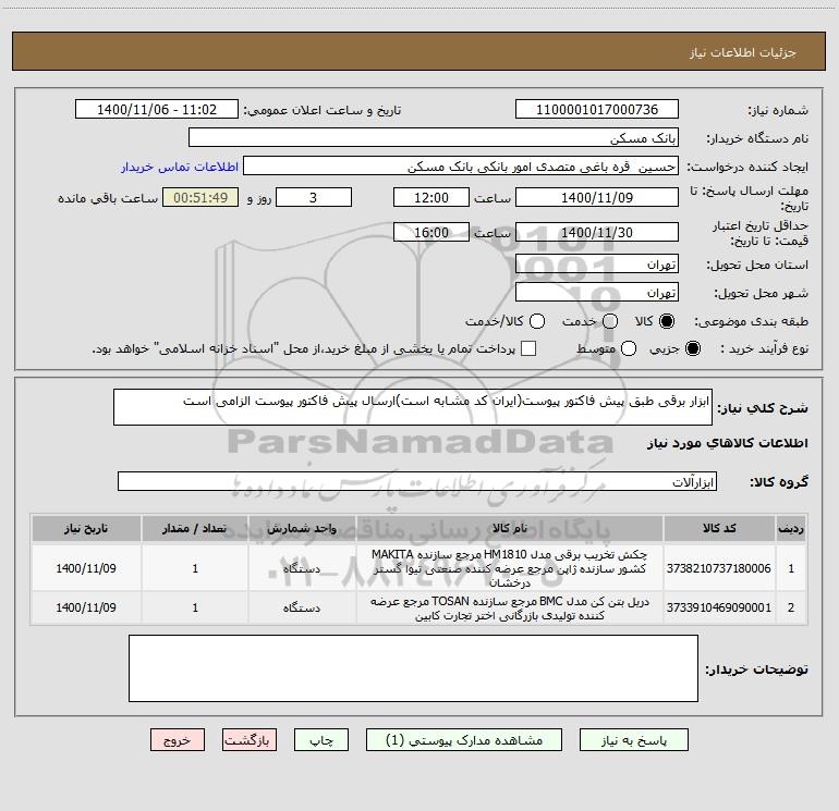 شرح کلی نیاز: ابزار برقی طبق پیش فاکتور پیوست(ایران کد مشابه است)ارسال پیش فاکتور پیوست الزامی است