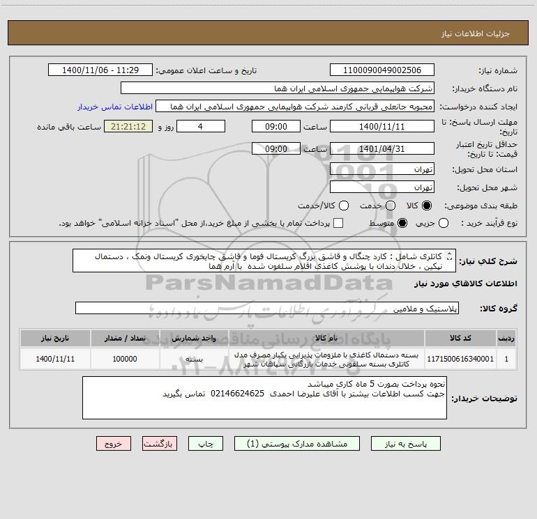شرح کلی نیاز: کاتلری شامل : کارد چنگال و قاشق بزرگ کریستال فوما و قاشق چایخوری کریستال ونمک ، دستمال نپکین ، خلال دندان با پوشش کاغذی اقلام سلفون شده با آرم هما