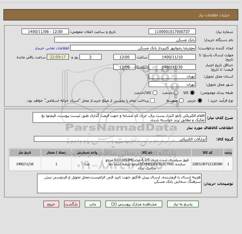 شرح کلی نیاز: اقلام الکتریکی تابلو کنترل پست برق. ابران کد مشابه و جهت قیمت گذاری طبق لیست پیوست. قیمتها بع تفکیک و مطابق برند خواسته شده.