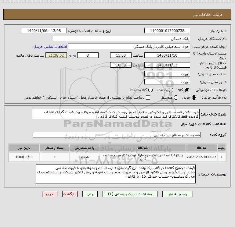 استعلام بها و موضوع استعلام استعلام خرید اقلام تاسیساتی و الکتریکی مطابق تصویر پیوست،کدکالا مشابه و صرفا جهت قیمت گذاری انتخاب گردیده،فقط کالاهای قید شده در تصویر پیوست قیمت گذاری گردد . به اطلاع کلیه شرکتها و افراد متخصص واجد شرایط میرساند، آگهی گذار در نظر دارد از طریق استعلام بها، نسبت به انتخاب و دریافت پیشنهادات اقدام نماید. این استعلام با کد آگهی ثبت شده در سامانه خبرگزاری پارس نماد : 4198481 منتشر شده است. مشخصات استعلام : تاریخ شروع استعلام: 1400/11/06 آخرین مهلت ارسال پیشنهاد قیمت : 1400/11/09 و محل اجرای پروژه : استان تهران میباشد. استعلام قیمت مورد درخواست : استعلام خرید اقلام تاسیساتی و الکتریکی مطابق تصویر پیوست،کدکالا مشابه و صرفا جهت قیمت گذاری انتخاب گردیده،فقط کالاهای قید شده در تصویر پیوست قیمت گذاری گردد . با دستهبندیهای تخصصی و گروه های مرتبط : صنایع روشنایی, تاسیسات ساختمانی, تجهیزات برق و الکترونیک, استعلام اطلاع رسانی میگردد. شرایط شرکت در استعلام آنلاین : ابتدا ثبت نام در سامانه استعلام پارس نماد و تکمیل مدارک موردنیاز و بارگذاری در سامانه رعایت تمامی ضوابط و الزامات مندرج در اسناد استعلام است.