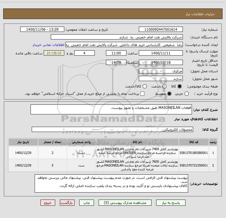 شرح کلی نیاز: قطعات MASONEILAN طبق مشخصات و تصویر پیوست.