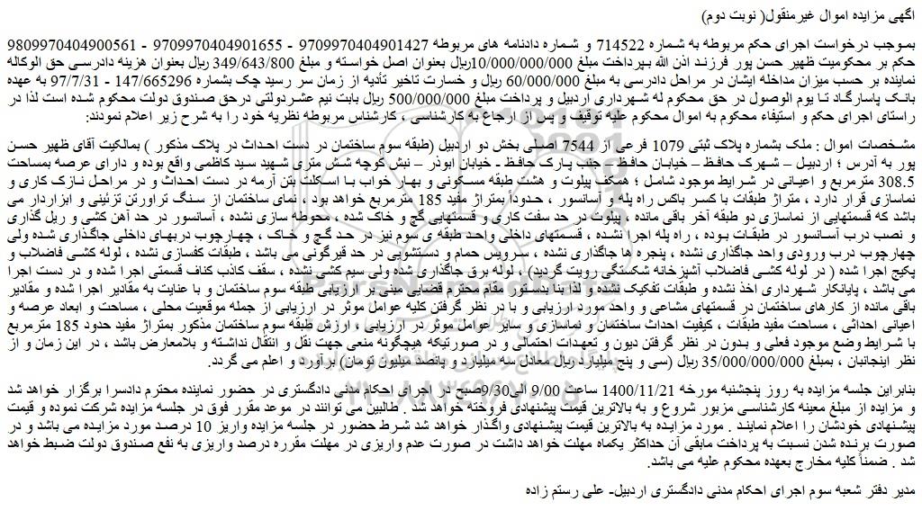بموجب درخواست اجرای حکم مربوطه به شماره 714522 و شماره دادنامه های مربوطه 9709970404901427 - 9709970404901655 - 9809970404900561 حکم بر محکومیت ظهیر حسن پور فرزند اذن الله بپرداخت مبلغ 10/000/000/000ریال بعنوان اصل خواسته و مبلغ 349/643/800 ریال بعنوان هزینه دادرسی حق الوکاله نماینده بر حسب میزان مداخله ایشان در مراحل دادرسی به مبلغ 60/000/000 ریال و خسارت تاخیر تأدیه از زمان سر رسید چک بشماره 147/665296 - 97/7/31 به عهده بانک پاسارگاد تا یوم الوصول در حق محکوم له شهرداری اردبیل و پرداخت مبلغ 500/000/000 ریال بابت نیم عشردولتی درحق صندوق دولت محکوم شده است لذا در راستای اجرای حکم و استیفاء محکوم به اموال محکوم علیه توقیف و پس از ارجاع به کارشناسی ، کارشناس مربوطه نظریه خود را به شرح زیر اعلام نمودند: