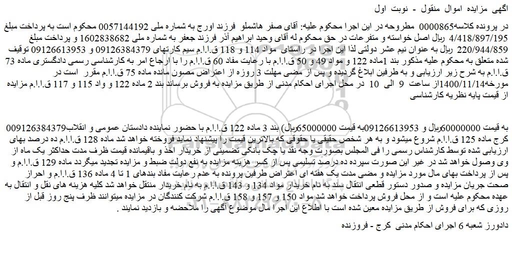 009126384379به قیمت 60000000ریال و 09126613953به قیمت 65000000ریال) بند 3 ماده 122 ق.ا.ا.م با حضور نماینده دادستان عمومی و انقلاب کرج ماده 125 ق.ا.ا.م شروع میشود و به هر شخص حقیقی یا حقوقی که بالاترین قیمت را پیشنهاد نماید فروخته خواهد شد ماده 128 ق.ا.ا.م ده درصد بهای ارزیابی شده توسط کارشناس رسمی را فی المجلس بصورت وجه نقد یا چک بانکی تضمینی از خریدار اخذ و باقیمانده قیمت ظرف مدت حداکثر یک ماه از وی وصول خواهد شد در غیر این صورت سپرده ده درصد تسلیمی پس از کسر هزینه مزایده به نفع دولت ضبط و مزایده تجدید میگردد ماده 129 ق.ا.ا.م و پس از پرداخت بهای مال مورد مزایده و مضی مدت یک هفته ای اعتراض طرفین پرونده به عدم رعایت مفاد بندهای 1 تا 4 ماده 136 ق.ا.ا.م و احراز صحت جریان مزایده و صدور دستور قطعی انتقال سند به نام خریدار مواد 134 و 143 ق.ا.ا.م به نام خریدار منتقل خواهد شد کلیه هزینه های نقل و انتقال به عهده محکوم علیه است و از محل فروش پرداخت خواهد شد مواد 150 و 157 و 158 ق.ا.ا.م شرکت کنندگان در مزایده میتوانند ظرف پنج روز قبل از روزی که برای فروش از طریق مزایده معین شده است با اطلاع این اجرا مال موضوع آگهی را ملاحضه و بازدید نمایند .