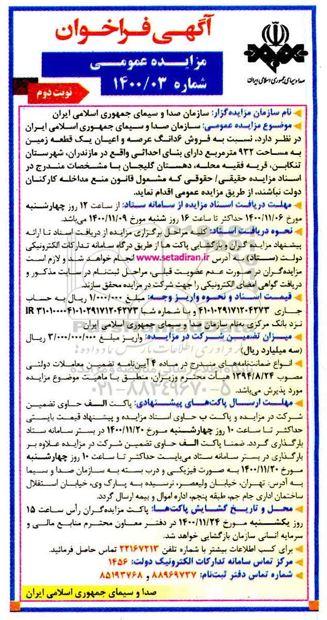 مزایده عمومی مزایده فروش ششدانگ عرصه و اعیان یک قطعه زمین 932 مترمربع نوبت دوم برگزار میگردد. از کلیه افراد متخصص و شرکتهای واجد شرایط دعوت به عمل میآید تا در این مزایده با کد خبرگزاری پارس نماد : 4201101 شرکت نمایند تاریخ شروع مزایده : 1400/11/07 مهلت شرکت در مزایده: تا پایان روز 1400/11/09 مکان برگزاری اموال واگذاری استانهای مازندران و دستهبندیهای مربوط به این حراجی املاک و زمین میباشد.