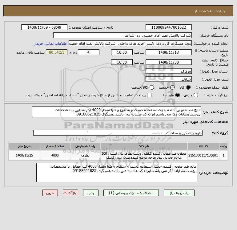 شرح کلی نیاز: مایع ضد عفونی کننده جهت استفاده دست و سطوح و هوا مقدار 4000 لیتر مطابق با مشخصات پیوست/شایان ذکر می باشد ایران کد مشابه می باشد.عسگری 09188621825