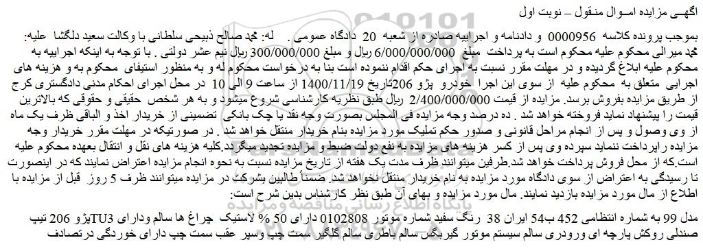 بموجب پرونده کلاسه  0000956  و دادنامه و اجراییه صادره از شعبه  20  دادگاه عمومی .    له: محمد صالح ذبیحی سلطانی با وکالت سعید دلگشا  علیه:  محمد میرالی محکوم علیه محکوم است به پرداخت  مبلغ  6/000/000/000 ریال و مبلغ 300/000/000 ریال نیم عشر دولتی . با توجه به اینکه اجراییه به محکوم علیه ابلاغ گردیده و در مهلت مقرر نسبت به اجرای حکم اقدام ننموده است بنا به درخواست محکوم له و به منظور استیفای  محکوم به و هزینه های اجرایی  متعلق به  محکوم علیه  از سوی این اجرا  خودرو  پژو 206تاریخ 1400/11/19 از ساعت 9 الی 10  در محل اجرای احکام مدنی دادگستری کرج از طریق مزایده بفروش برسد. مزایده از قیمت 2/400/000/000  ریال طبق نظریه کارشناسی شروع میشود و به هر شخص  حقیقی و حقوقی که بالاترین قیمت را پیشنهاد نماید فروخته خواهد شد . ده درصد وجه مزایده فی المجلس بصورت وجه نقد یا چک بانکی  تضمینی از خریدار اخذ و الباقی ظرف یک ماه از وی وصول و پس از انجام مراحل قانونی و صدور حکم تملیک مورد مزایده بنام خریدار منتقل خواهد شد . در صورتیکه در مهلت مقرر خریدار وجه مزایده راپرداخت ننماید سپرده وی پس از کسر هزینه های مزایده به نفع دولت ضبط و مزایده تجدید میگردد.کلیه هزینه های نقل و انتقال بعهده محکوم علیه است.که از محل فروش پرداخت خواهد شد.طرفین میتوانند ظرف مدت یک هفته از تاریخ مزایده نسبت به نحوه انجام مزایده اعتراض نمایند که در اینصورت تا رسیدگی به اعتراض از سوی دادگاه مورد مزایده به نام خریدار منتقل نخواهد شد. ضمناً طالبین بشرکت در مزایده میتوانند ظرف 5 روز  قبل از مزایده با اطلاع از مال مورد مزایده بازدید نمایند. مال مورد مزایده و بهای آن طبق نظر کارشناس بدین شرح است:
