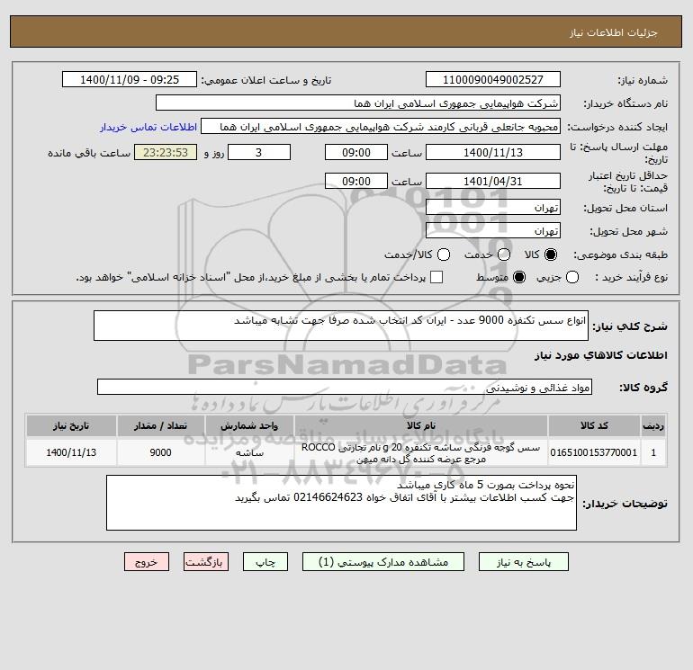 شرح کلی نیاز: انواع سس تکنفره 9000 عدد - ایران کد انتخاب شده صرفا جهت تشابه میباشد