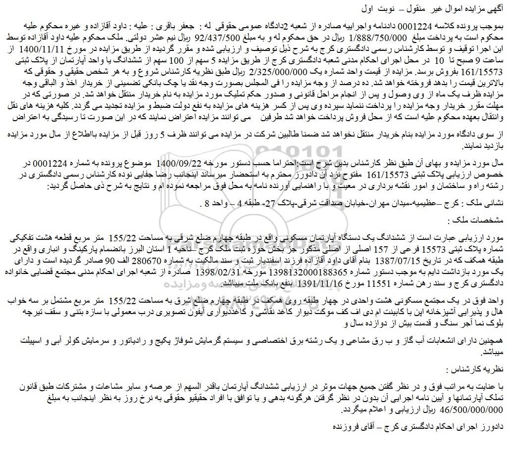 بموجب پرونده کلاسه 0001224 دادنامه واجراییه صادره از شعبه 2دادگاه عمومی حقوقی له : جعفر باقری : علیه : داود آقازاده و غیره محکوم علیه محکوم است به پرداخت مبلغ 1/888/750/000 ریال در حق محکوم له و به مبلغ 92/437/500 ریال نیم عشر دولتی. ملک محکوم علیه داود آقازاده توسط این اجرا توقیف و توسط کارشناس رسمی دادگستری کرج به شرح ذیل توصیف و ارزیابی شده و مقرر گردیده از طریق مزایده در مورخ 1400/11/11 از ساعت 9 صبح تا 10 در محل اجرای احکام مدنی شعبه دادگستری کرج از طریق مزایده 5 سهم از 100 سهم از ششدانگ یا واحد آپارتمان از پلاک ثبتی 161/15573 بفروش برسد. مزایده از قیمت واحد شماره یک 2/325/000/000 ریال طبق نظریه کارشناس شروع و به هر شخص حقیقی و حقوقی که بالاترین قیمت را بدهد فروخته خواهد شد. ده درصد از وجه مزایده را فی المجلس بصورت وجه نقد یا چک بانکی تضمینی از خریدار اخذ و الباقی وجه مزایده ظرف یک ماه از وی وصول و پس از انجام مراحل قانونی و صدور حکم تملیک مورد مزایده به نام خریدار منتقل خواهد شد. در صورتی که در مهلت مقرر خریدار وجه مزایده را پرداخت ننماید سپرده وی پس از کسر هزینه های مزایده به نفع دولت ضبط و مزایده تجدید می گردد. کلیه هزینه های نقل وانتقال بعهده محکوم علیه است که از محل فروش پرداخت خواهد شد طرفین می توانند مزایده اعتراض نمایند که در این صورت تا رسیدگی به اعتراض