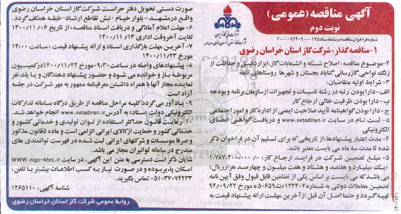 2- موضوع مناقصه: اصلاح شبکه و انشعابات گاز، ابزار دقیق و حفاظت از زنگ نواحی گازرسانی گناباد بجستان و شهرها روستاهای تابعه