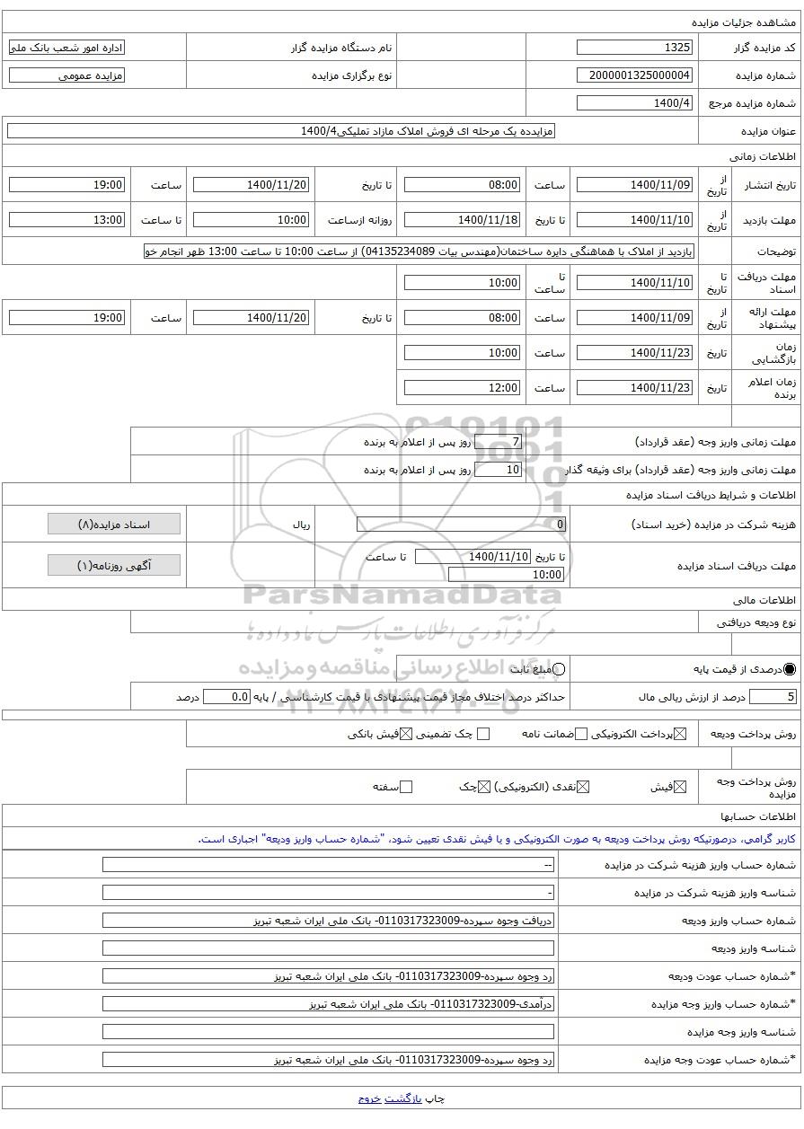 | شماره مال | 2100001325000075 | نوع برگزاری مزایده | مزایده عمومی | |