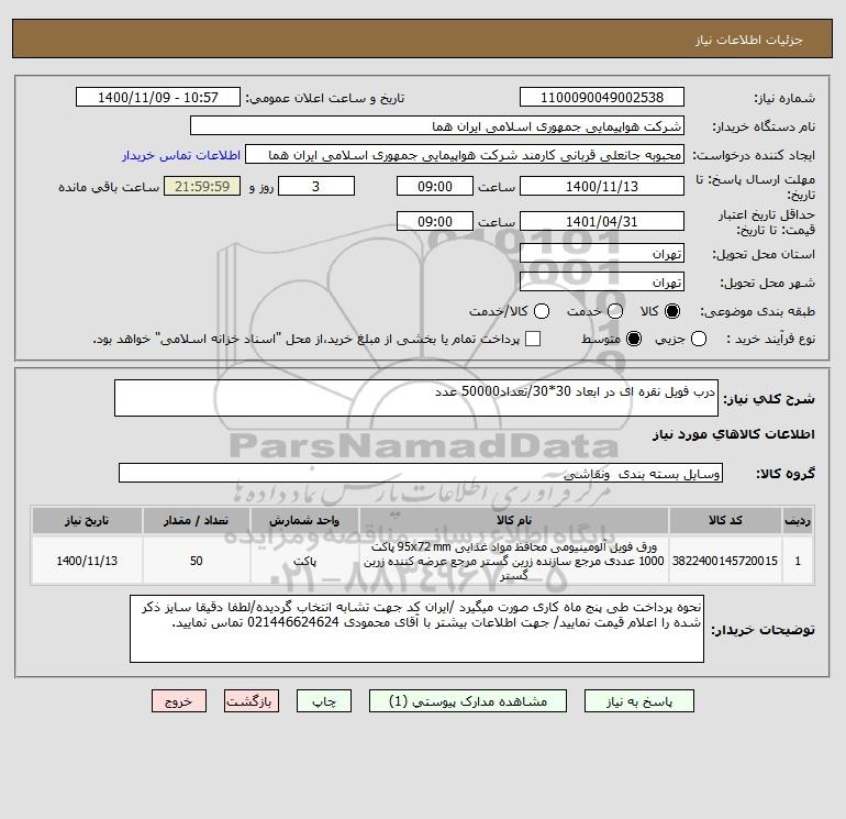 شرح کلی نیاز: درب فویل نقره ای در ابعاد 30*30/تعداد50000 عدد
