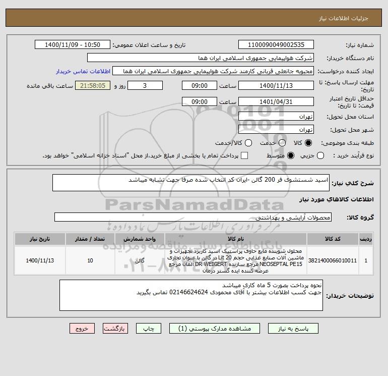 شرح کلی نیاز: اسید شستشوی فر 200 گالن -ایران کد انتخاب شده صرفا جهت تشابه میباشد