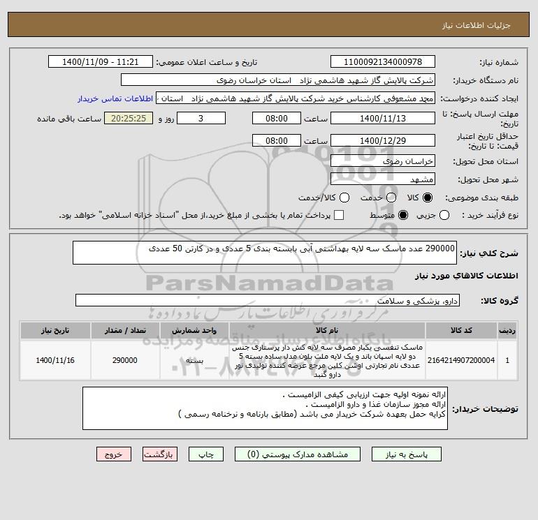 نام دستگاه خریدار:شرکت پالایش گاز شهید هاشمی نژاد استان خراسان رضوی