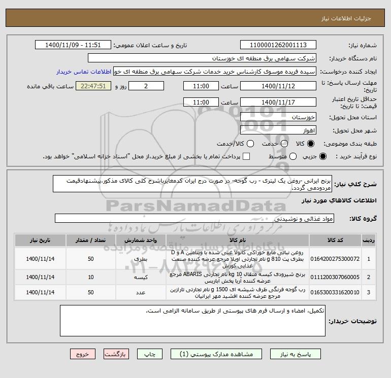 شرح کلی نیاز: برنج ایرانی -روغن یک لیتری - رب گوجه- در صورت درج ایران کدمغایرباشرح کلی کالای مذکور،پیشنهادقیمت مردودمی گردد.